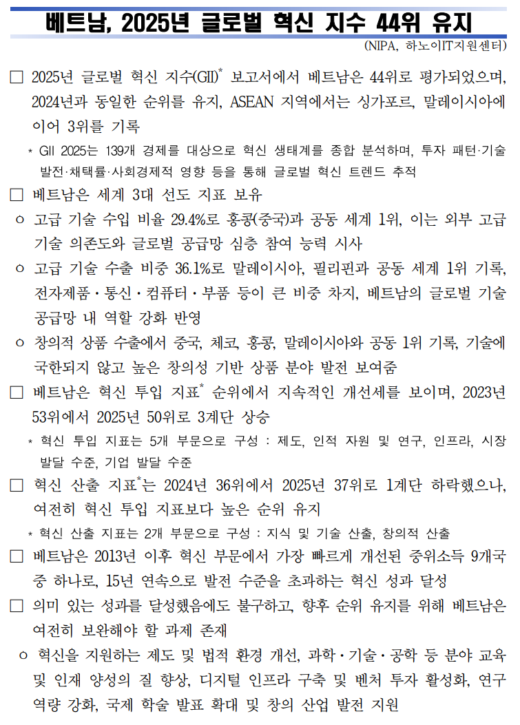 베트남, 2025년 글로벌 혁신 지수 44위 유지 (2025.09.23)