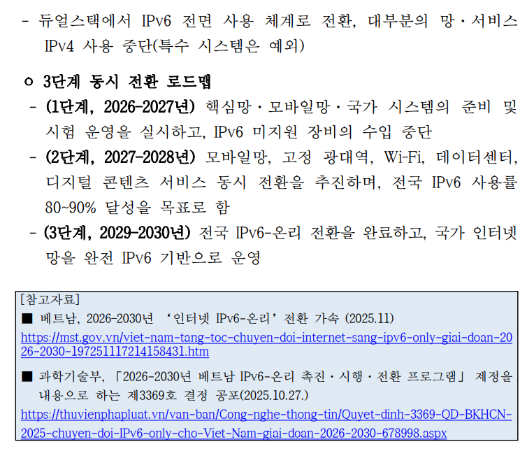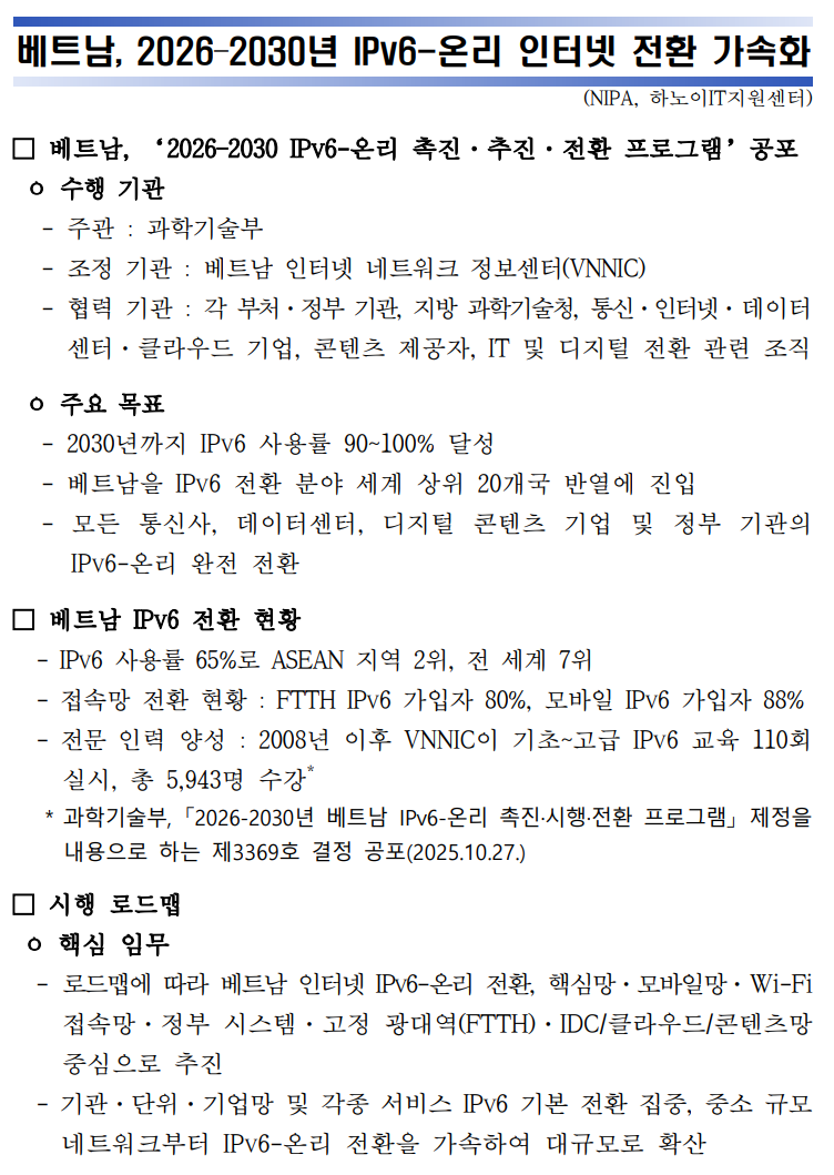 베트남, 2026–2030년 IPv6-온리 인터넷 전환 가속화 (2025.12.11)